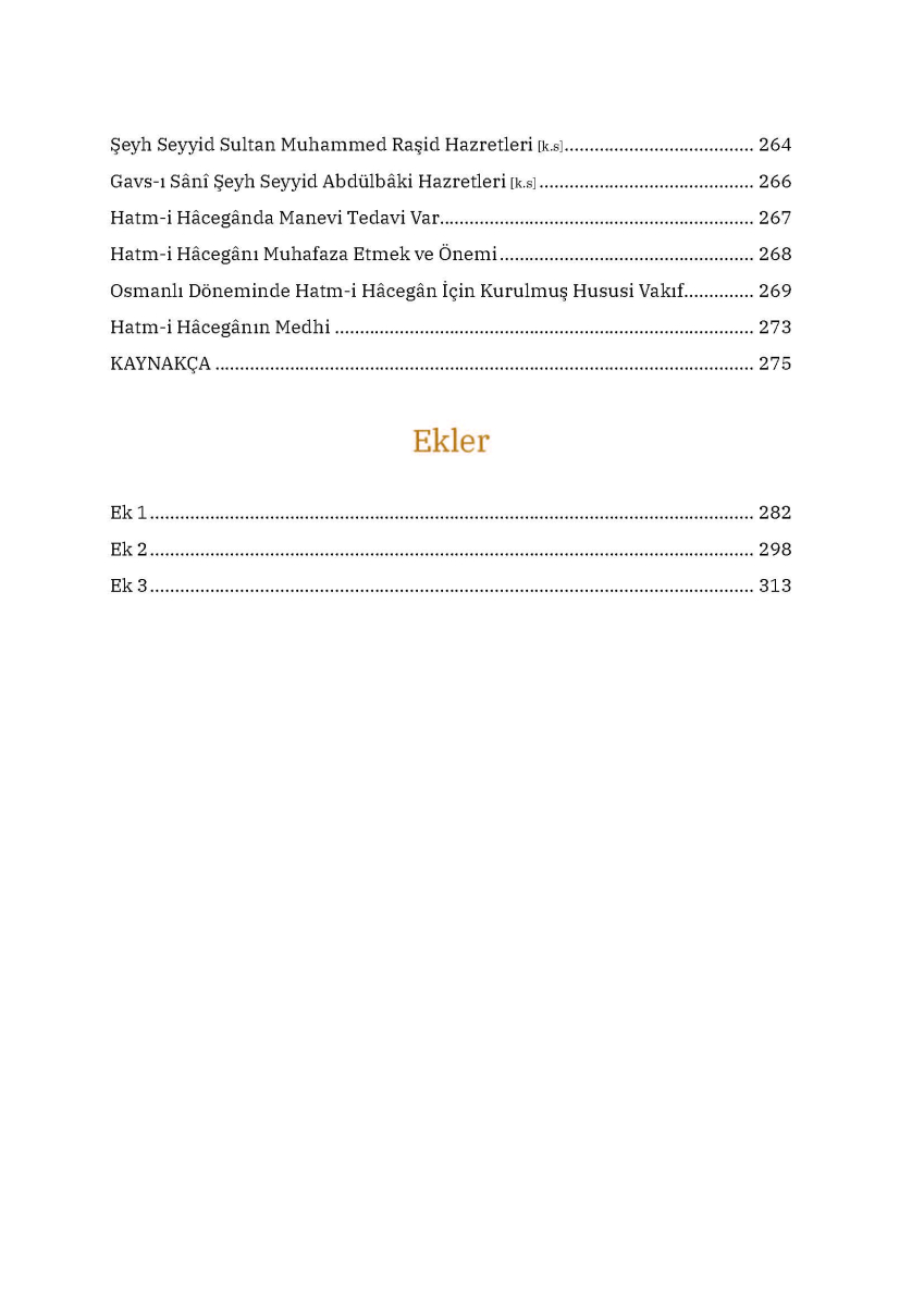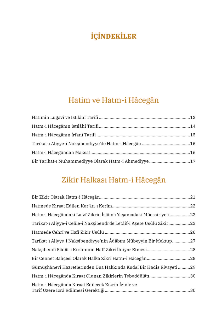 Nakşibendiyye tarikatının esaslarından biri hatm-i hacegândır. Sâdât-ı kirâmın üzerinde çokça durduğu bu esas, nefsin ıslahı ve istikamet için cemaatin önemini gözeten bir ameldir. Dinimizde zikre verilen değer ve Hz. Peygamber’in [sallallahu aleyhi vesellem] zikir meclislerini ayrıca methi düşünüldüğünde bu kıymetli amelin ehemmiyeti ortaya çıkmaktadır. Hatm-i hacegânın mahiyeti, önemi ve delilleri yanında Nakşibendiyye sâdâtı silsilesinin sunulduğu eser, üslup olarak ilim ehline hitap eden bir “prestij kitabı” olma hüviyeti taşıyor.