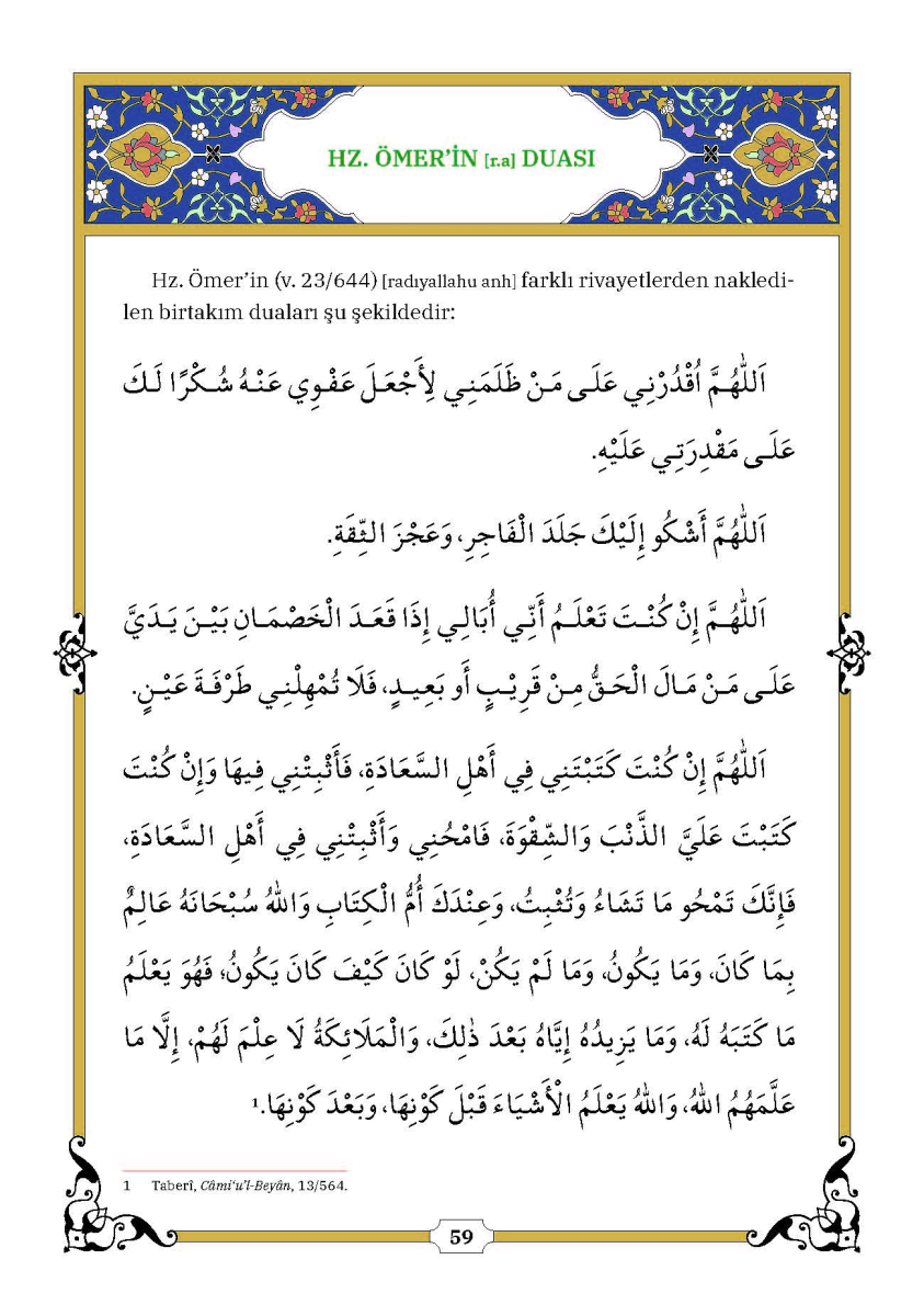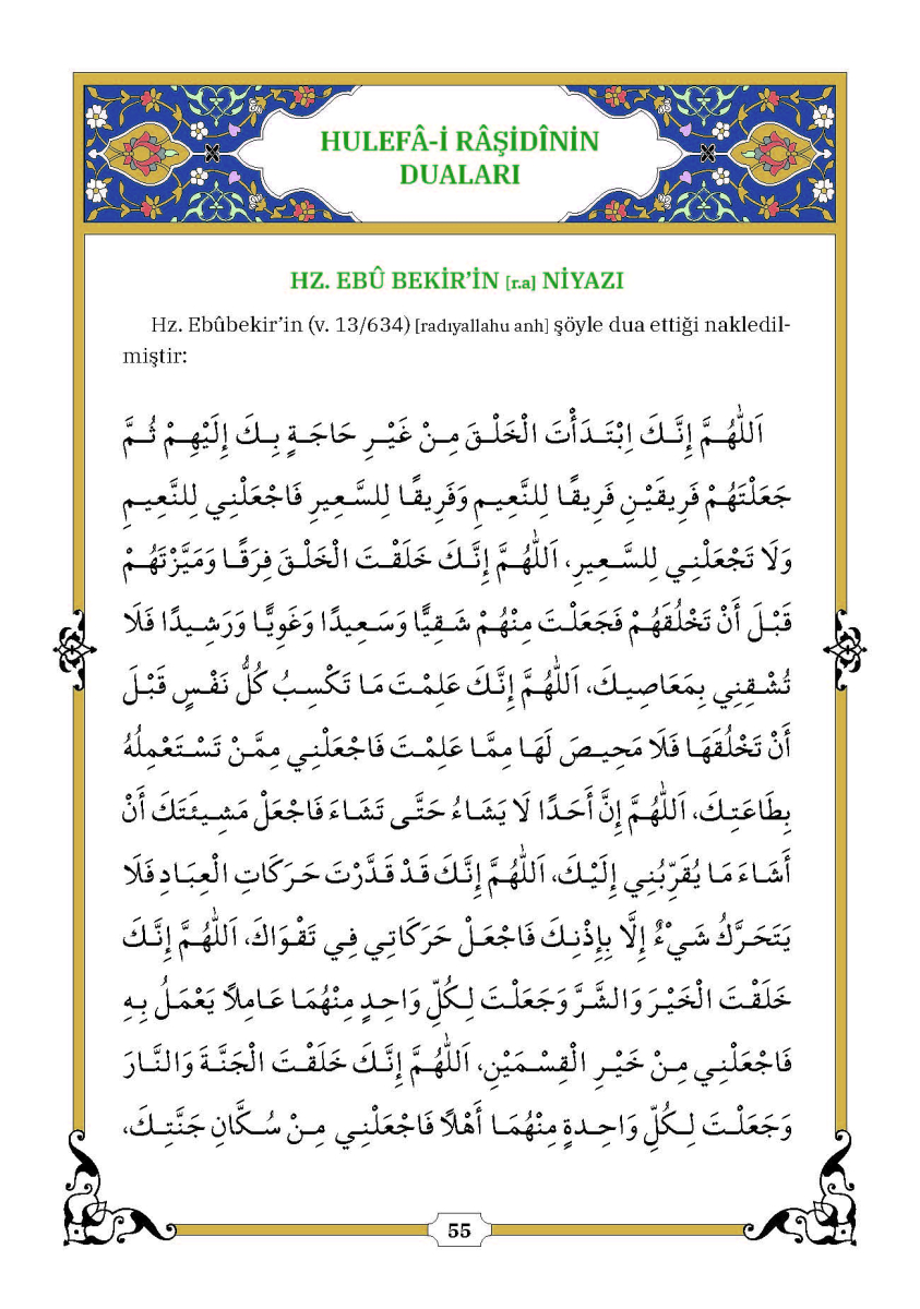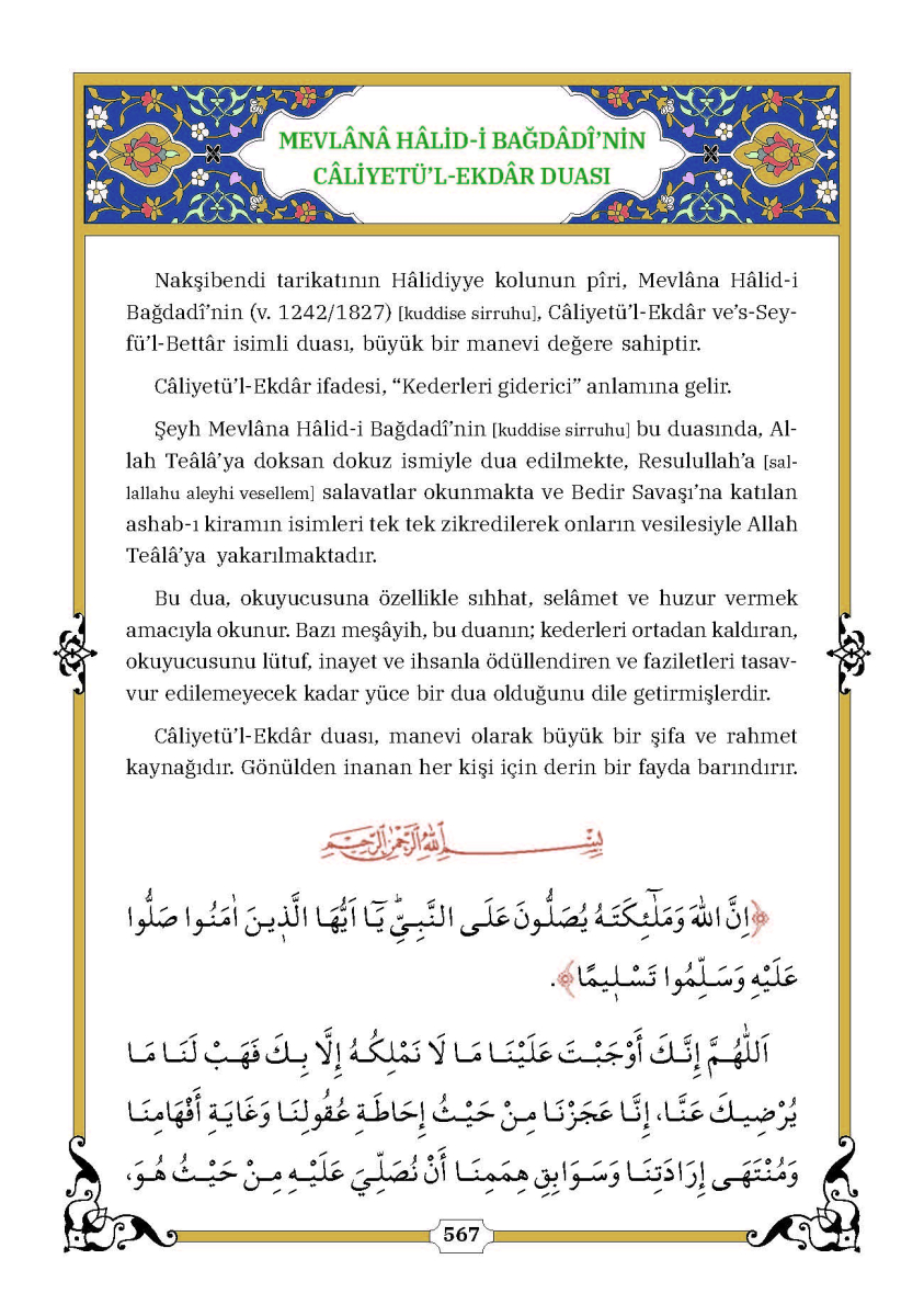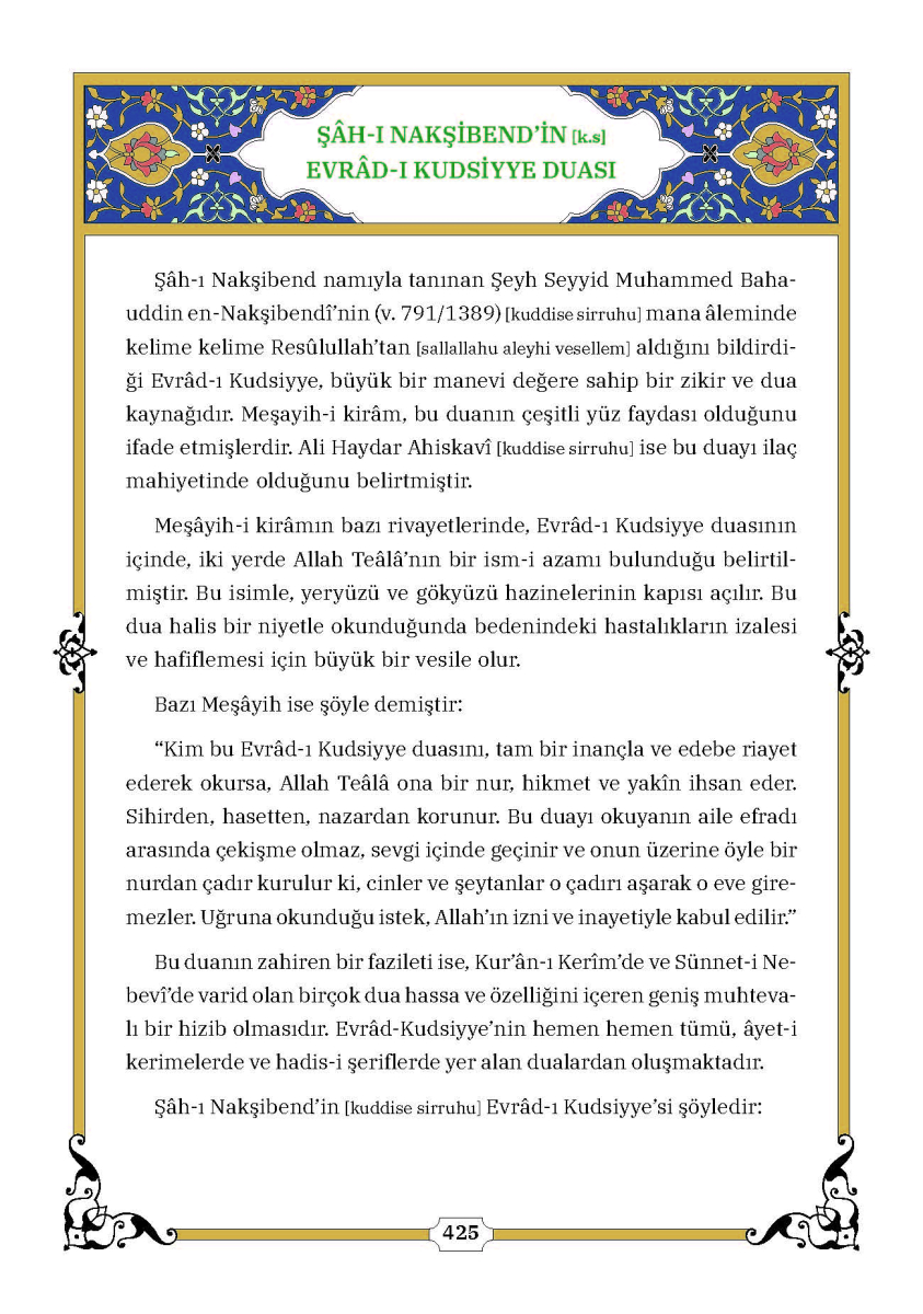 Kur’ân-ı Kerîm’de yer alan dua âyetlerinden, hadis-i şeriflerdeki niyazlara; peygamberlerin münâcâtlarından sadât-ı kirâmın dualarına kadar yüzlerce dua bu eserde bir araya getirildi.